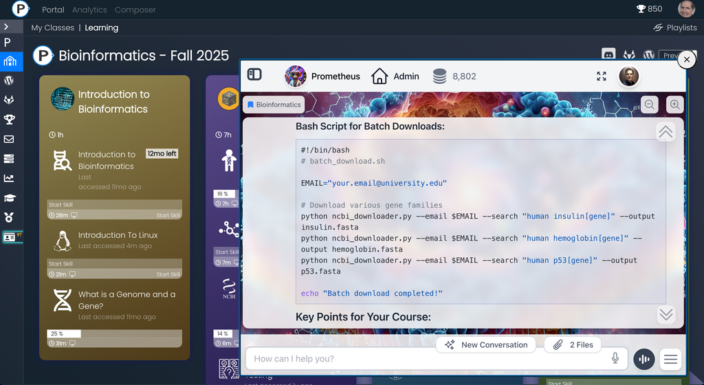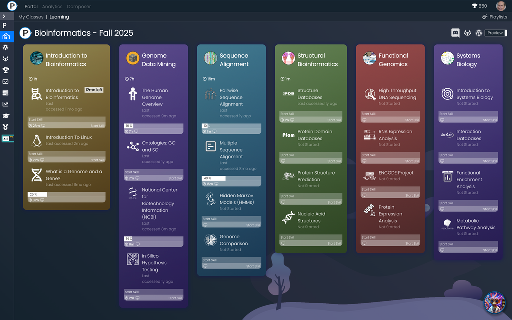 The Praxis Bioinformatics journey (featuring Dr. Alex Feltus) leverages AI-powered curation, hands-on data-intensive compute environments (Praxis Cloud), video assessment, quizzes, and expert mentoring (featuring Discord) to teach students how to use bioinformatics workflows to solve today’s toughest genomics problems.